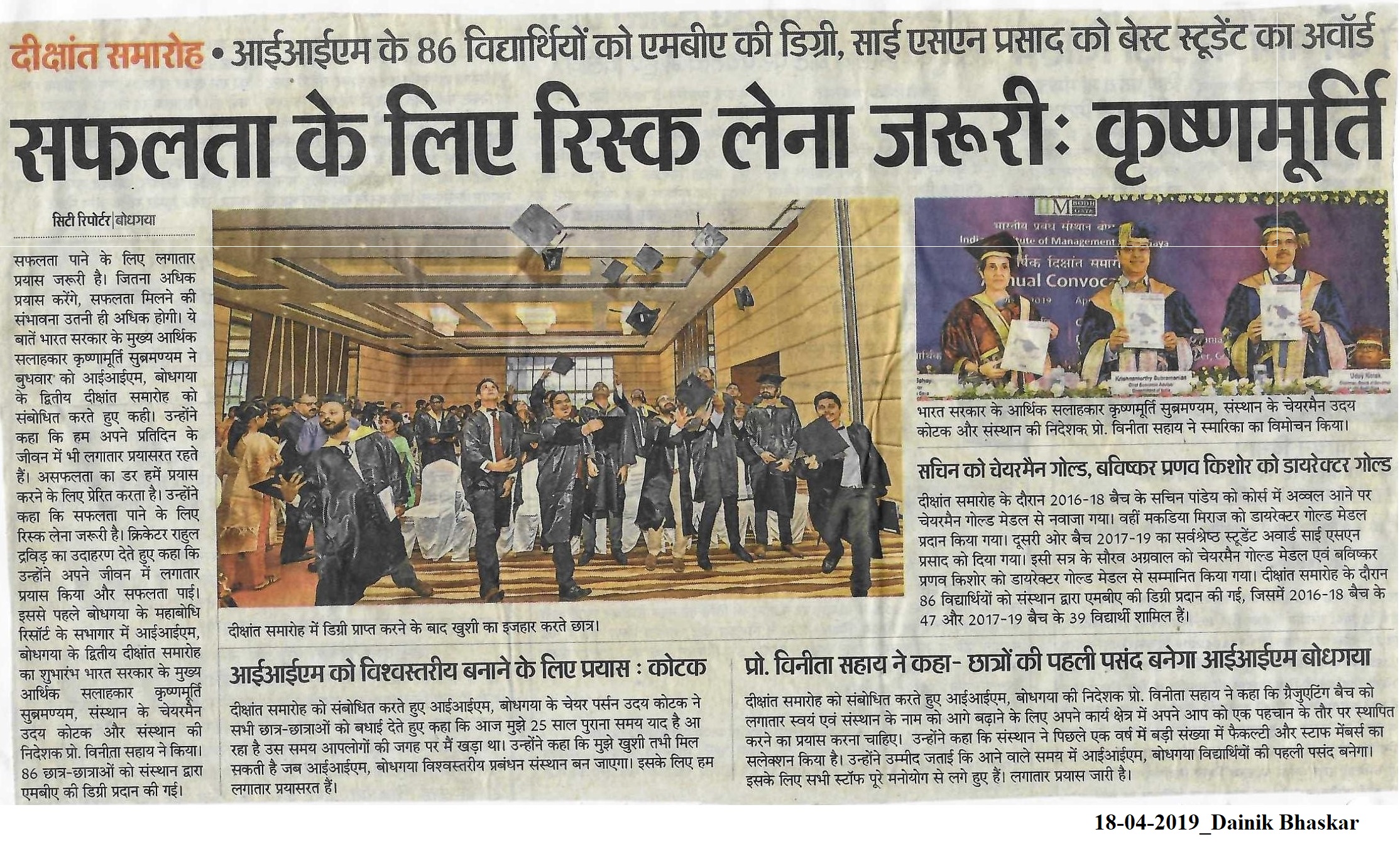Convocation, 2nd Annual Convocation, Convocation 2019, Dr. Vinita S. Sahay- Director of IIM Bodh Gaya, Dr. Krishnamurthy Subramanian-Economic Adviser-Government of India, Shri Uday Kotak-MD and CEO of Kotak Mahindra Bank Ltd.