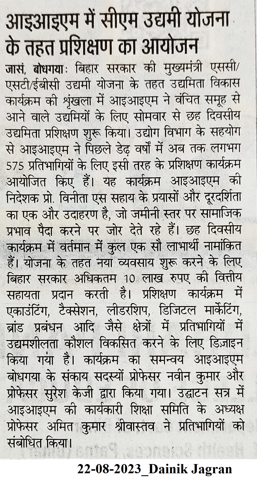 आइआइएम में सीएम उद्यमी योजना के तहत प्रशिक्षण का आयोजन