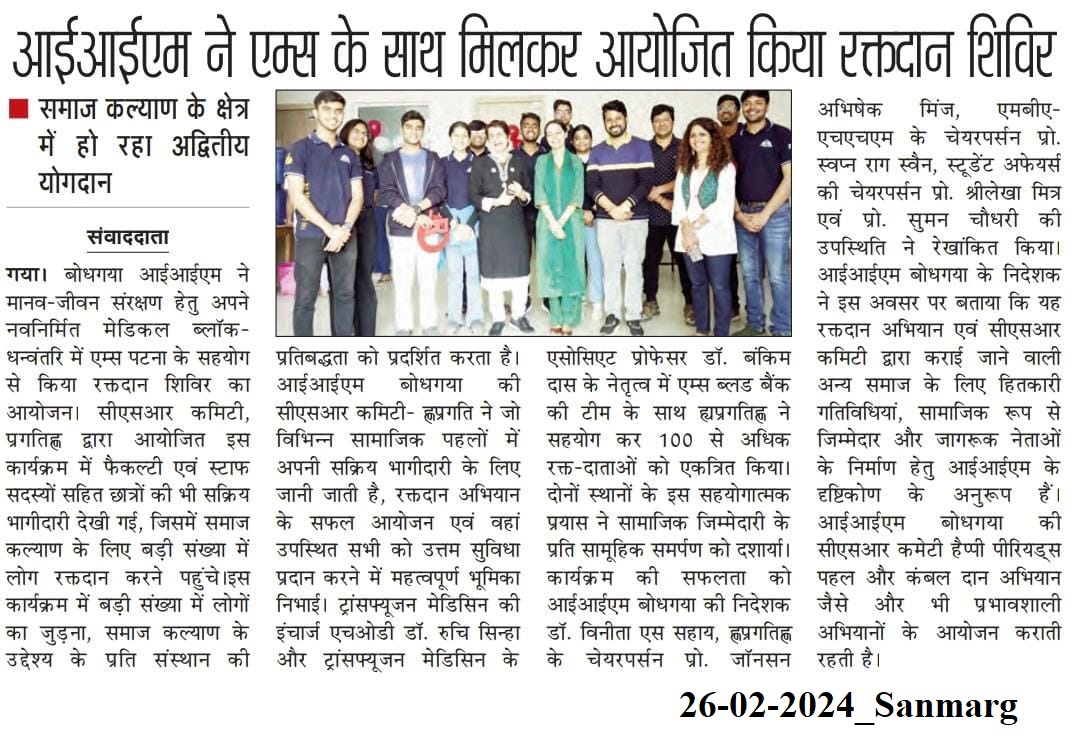 Pragati-CSR Committee, Blood Donation Camp, AIIMS Patna, Dr. Vinita S. Sahay- Director of IIM Bodh Gaya, Dr. Sreelekha Mishra- IIM Bodh Gaya, Dr. Suman Choudhary- IIM Bodh Gaya, Dr. Johnson Abhishek Minz- IIM Bodh Gaya, Dr. Swapnarag Swain- IIM Bodh Gaya, Dhanvantari- Medical Block, Dr. Ruchi Sinha- AIIMS Panta, Dr. Bankim Das- AIIMS Patna