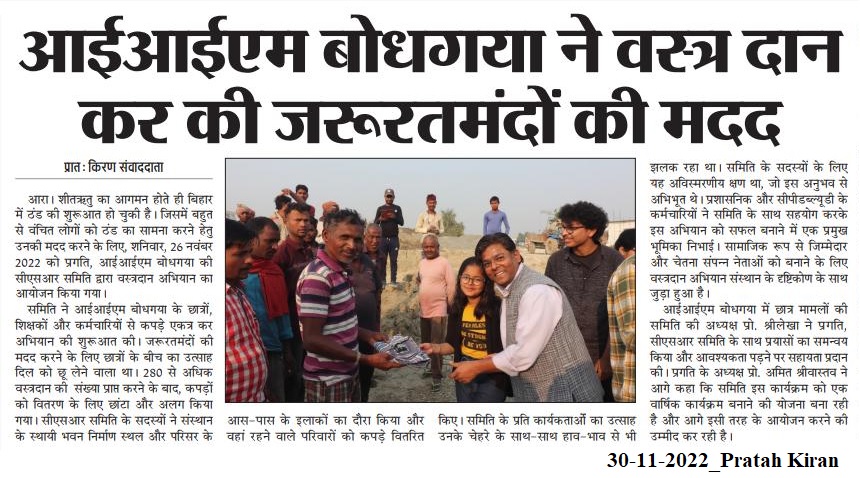 आईआईएम बोधगया ने वस्त्र दान कर की जरूरतमंदों की मदद