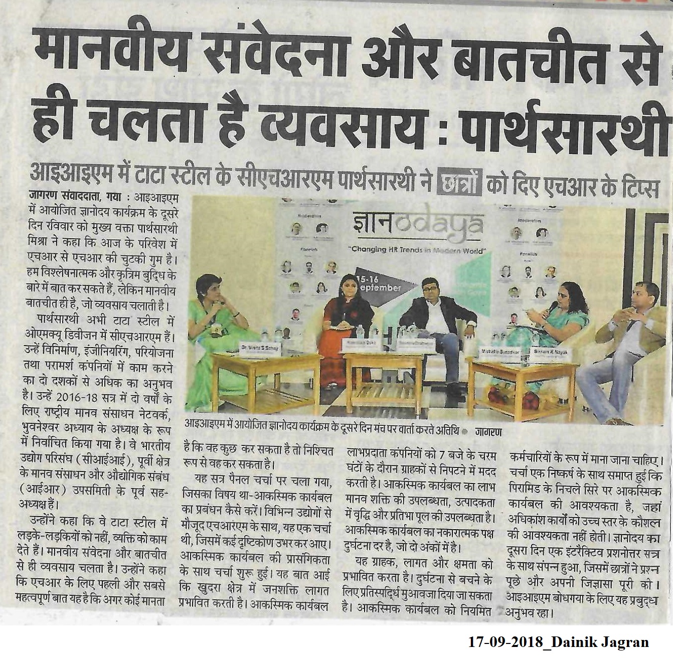 HR Conclave, Gyanodaya, Gyanodaya 1.0, Dr. Vinita S. Sahay- Director of IIM Bodh Gaya, Shri Manoj Kumar- Vice President-HR at Reliance Industries Ltd., Shri Parthasarathi Mishra-CHRM at Tata Steel, Shri Sumit Sabharwal- Head HR of Fujitsu Consulting India