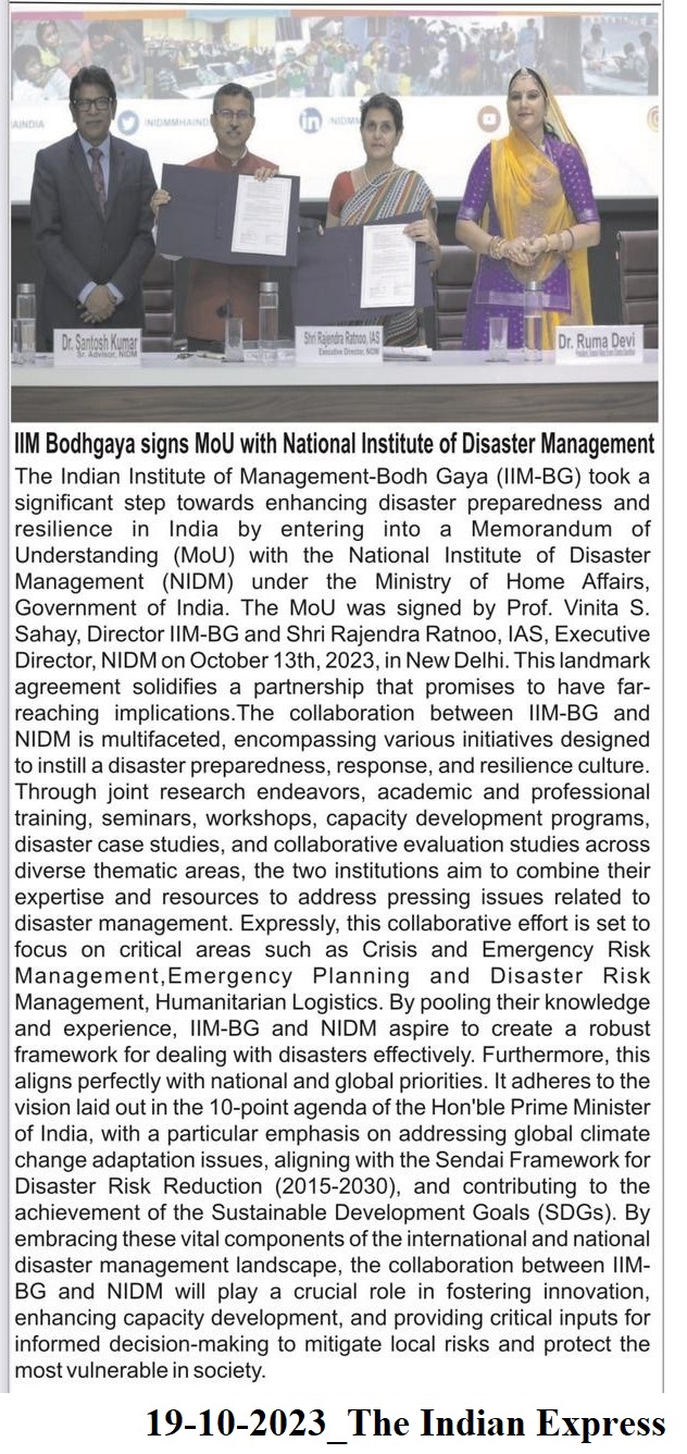IIM Bodh Gaya signs MoU with National Institute of Disaster Management