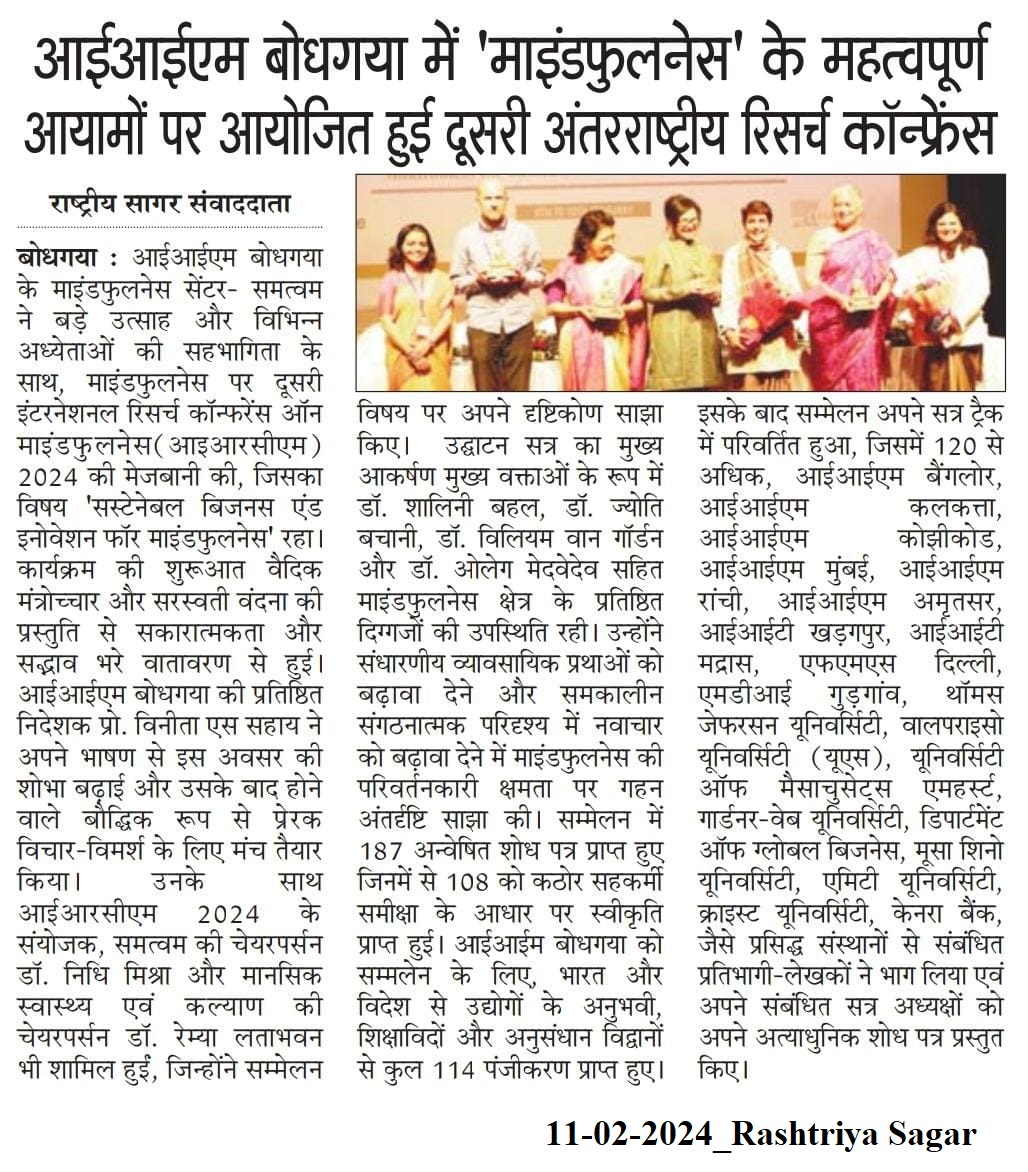 आईआईएम बोधगया में 'माइंडफुलनेस' के महत्वपूर्ण आयामों पर आयोजित हुई दूसरी अंतरराष्ट्रीय रिसर्च कॉन्फ्रेंस
