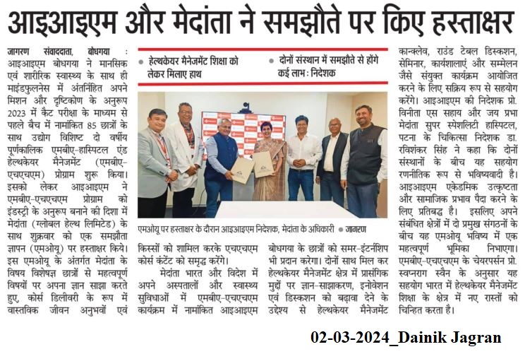 Memorandum of Understanding, MoU, Indian Institute of Management (IIM) Bodh Gaya, Dr. Vinita S. Sahay- Director of IIM Bodh Gaya, Dr. Swapnarag Swain- IIM Bodh Gaya, MBA-HHM, MBA-Hospital and Healthcare Management, Medanta (Global Health Limited), Jay Prabha Medanta Super Specialty Hospital- Patna, Dr. Ravi Shankar Singh- Director of Medanta