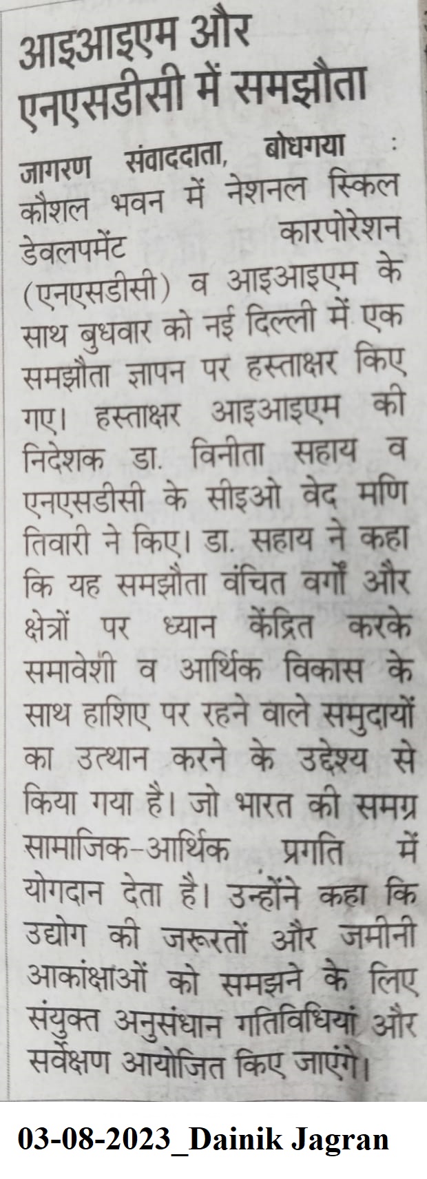 Memorandum of Understanding, MoU, Indian Institute of Management Bodh Gaya, Dr. Vinita S. Sahay- Director of IIM Bodh Gaya, National Skill Development Corporation (NSDC), Mr. Ved Mani Tiwari- CEO of NSDC, Ministry of Skill Development and Entrepreneurship- Govt. of India, IIM Bodh Gaya, IIMBG
