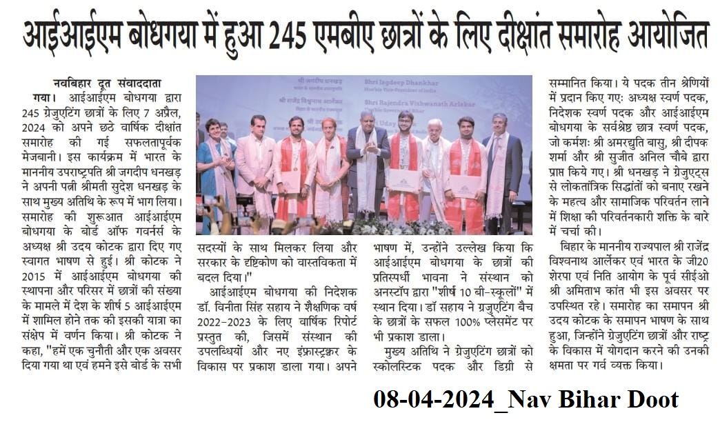 Convocation, 6th Annual Convocation, Convocation 2024, Jagdeep Dhankhar- Vice President of India, Rajendra Arlekar- Governor of Bihar, Shri Uday Kotak- Chairperson- IIM Bodh Gaya, Dr. Vinita S. Sahay- Director of IIM Bodh Gaya