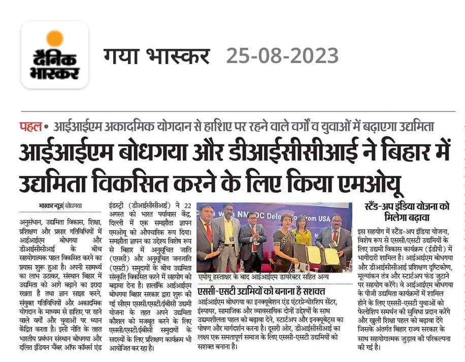 आईआईएम बोधगया और डीआईसीसीआई ने बिहार में उद्यमिता विकसित करने के लिए किया एमओयू