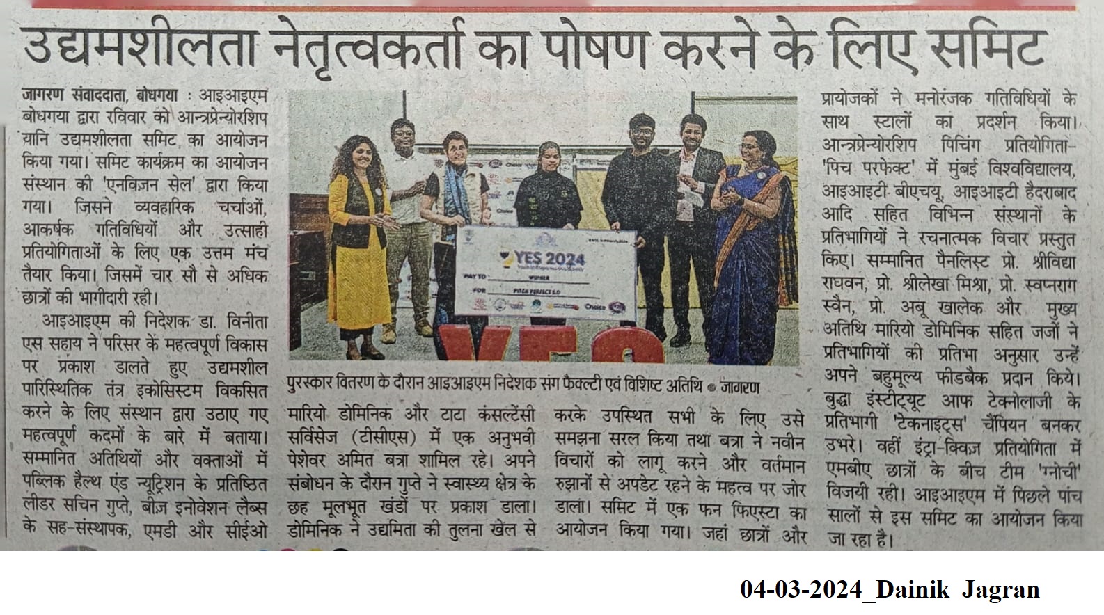 Youth Entrepreneurship Summit, YES 2024, Envision Cell, Entrepreneurship and Industrial Relations Cell, Startup, Entrepreneurship, Dr. Vinita S. Sahay- Director of IIM Bodh Gaya, National Bank for Agriculture and Rural Development (NABARD), Shri Sachin Gupte, Mario Dominic