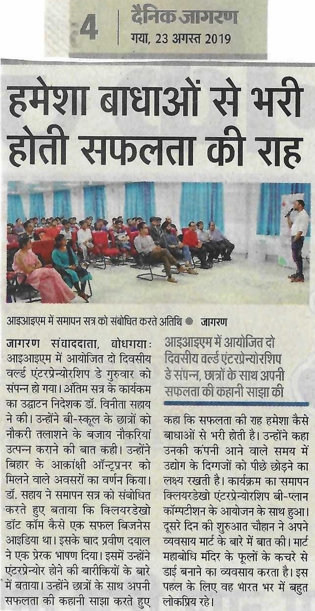 World Entrepreneurship Day, Dr. Vinita S. Sahay- Director of IIM Bodh Gaya, Mr. Saurabh Dayal- Co-Founder at Cleardekho.com