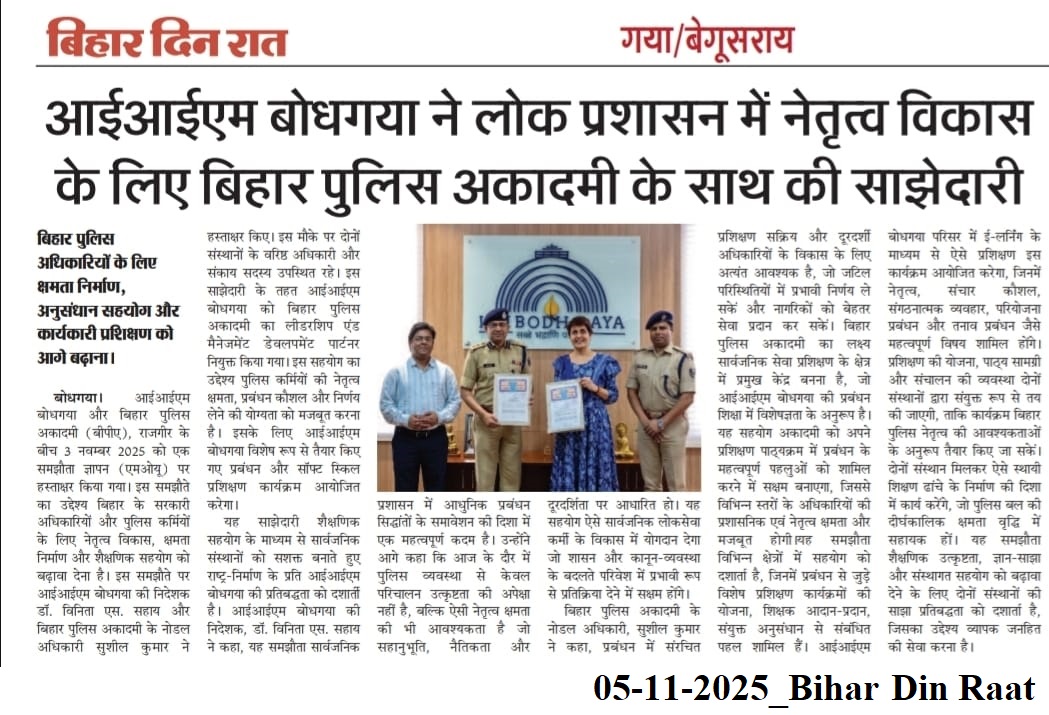 आईआईएम बोधगया ने लोक प्रशासन में नेतृत्व विकास के लिए बिहार पुलिस अकादमी के साथ की साझेदारी