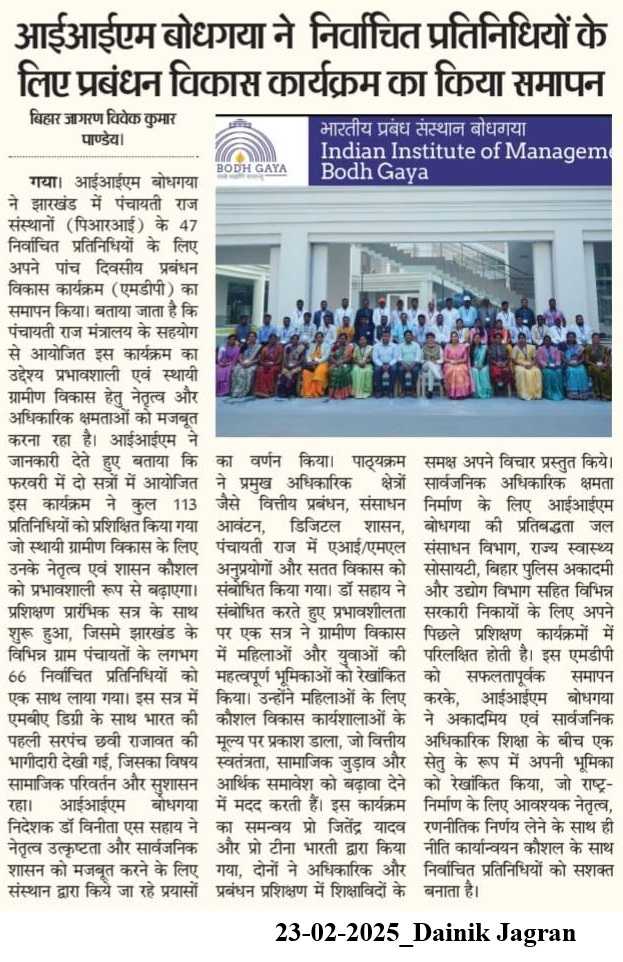 आईआईएम बोधगया ने निर्वाचित प्रतिनिधियों के लिए प्रबंधन विकास कार्यक्रम का किया समापन