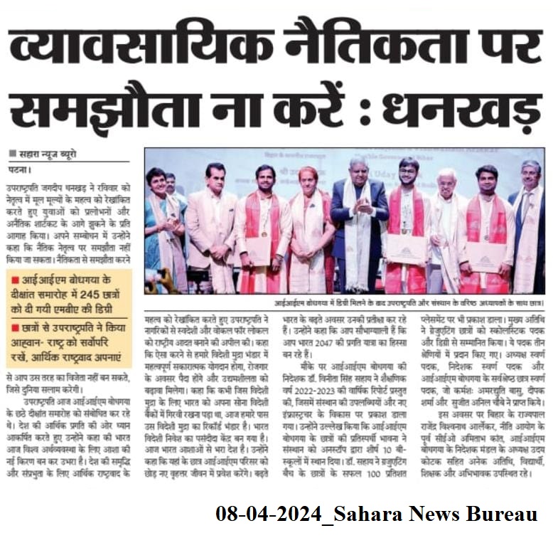 Convocation, 6th Annual Convocation, Convocation 2024, Jagdeep Dhankhar- Vice President of India, Rajendra Arlekar- Governor of Bihar, Shri Uday Kotak- Chairperson- IIM Bodh Gaya, Dr. Vinita S. Sahay- Director of IIM Bodh Gaya