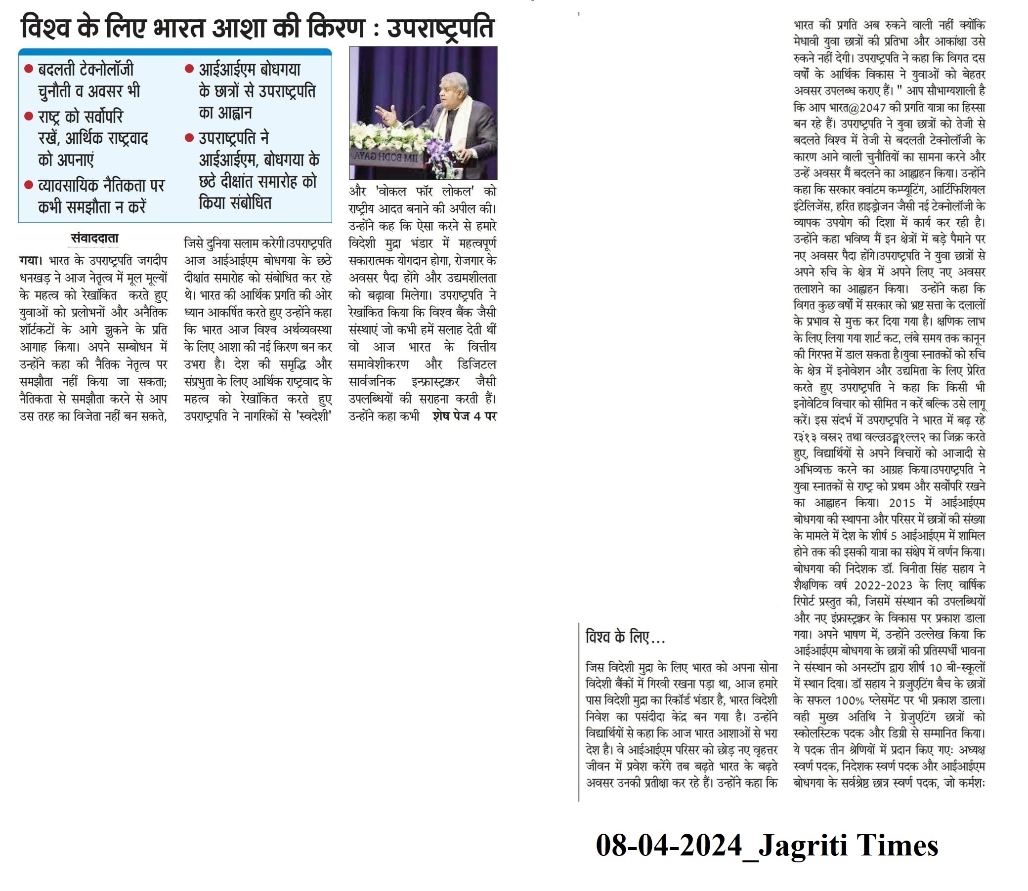 Convocation, 6th Annual Convocation, Convocation 2024, Jagdeep Dhankhar- Vice President of India, Rajendra Arlekar- Governor of Bihar, Shri Uday Kotak- Chairperson- IIM Bodh Gaya, Dr. Vinita S. Sahay- Director of IIM Bodh Gaya