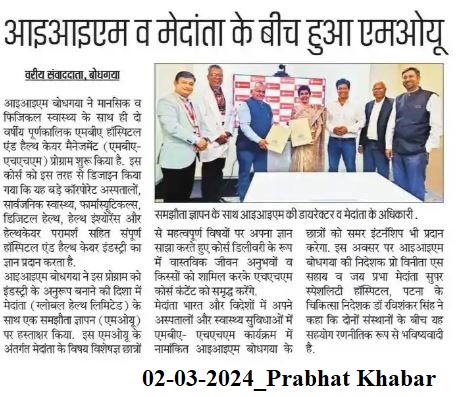 Memorandum of Understanding, MoU, Indian Institute of Management (IIM) Bodh Gaya, Dr. Vinita S. Sahay- Director of IIM Bodh Gaya, Dr. Swapnarag Swain- IIM Bodh Gaya, MBA-HHM, MBA-Hospital and Healthcare Management, Medanta (Global Health Limited), Jay Prabha Medanta Super Specialty Hospital- Patna, Dr. Ravi Shankar Singh- Director of Medanta