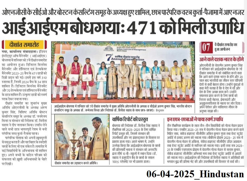 Convocation, 7th Annual Convocation, Convocation 2025, Dr. Vinita S. Sahay- Director of IIM Bodh Gaya, Dr. Janmejaya Sinha- Chairman of Boston Consulting Group (India), Mr. Arun Kumar Singh- Chairman and CEO of ONGC