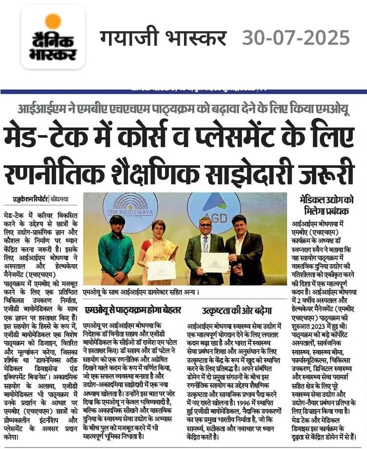 Memorandum of Understanding, MoU, Indian Institute of Management Bodh Gaya, Dr. Vinita S. Sahay- Director of IIM Bodh Gaya, Dr. Rajesh M. Patel- CEO of ADG Biomedicals, Dr. Swapnarag Swain- IIM Bodh Gaya