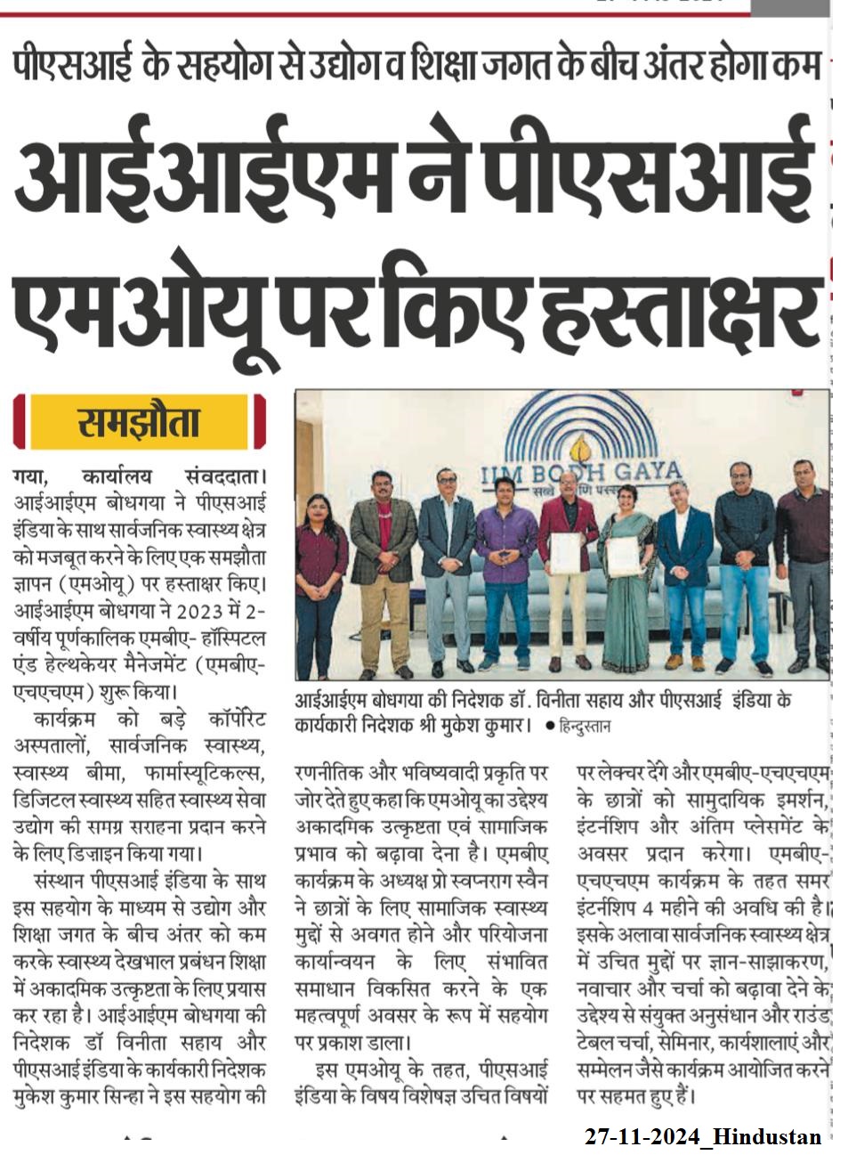Memorandum of Understanding, MoU, Indian Institute of Management (IIM) Bodh Gaya, Dr. Vinita S. Sahay- Director of IIM Bodh Gaya, PSI India, Social Health Sector, Mr. Mukesh Kumar Sharma- Executive Director of PSI India, Dr. Swapnarag Swain- IIM Bodh Gaya, MBA-HHM