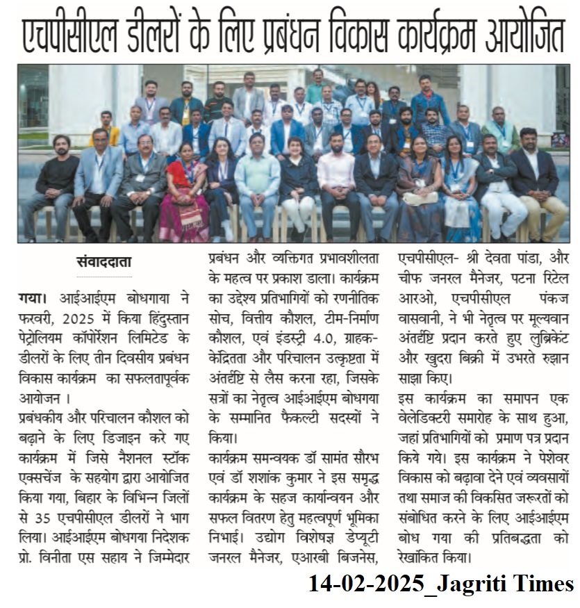 Management Development Program, MDP, MDP for dealers of Hindustan Petroleum Corporation Limited (HPCL), National Stock Exchange (NSE), Dr. Vinita S. Sahay- Director of IIM Bodh Gaya, Mr. Devrata Panda- Deputy General Manager- ARB Business- HPCL, Mr. Pankaj Vaswani- Chief General Manager- Patna Retail RO- HPCL