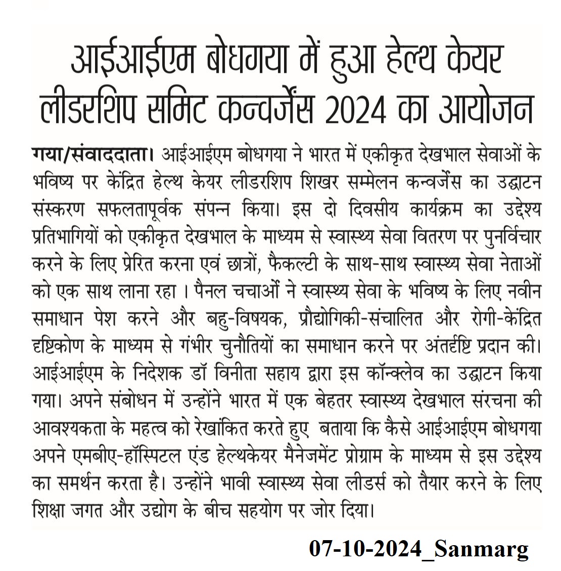 आईआईएम बोधगया में हुआ हेल्थ केयर लीडरशिप समिट कन्वर्जेंस 2024 का आयोजन