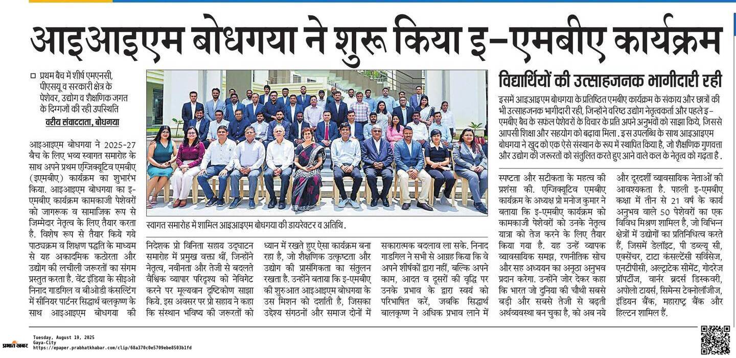 Executive MBA Programme, EMBA Programme Launch-1st Batch-202525-27, Inaugration of EMBA Programme, Executive Education-Working Professionals, Leadership Development, Industry–Academia Collaboration, Dr. Vinita S. Sahay- Director of IIM Bodh Gaya, Prof. Manoj Kumar- IIM Bodh Gaya, Ninad Gadgil- CEO of Wednt India