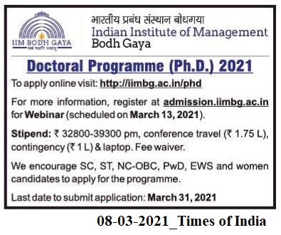 Advertisement for doctoral programme (Ph.D.) 2021 at IIM Bodh Gaya