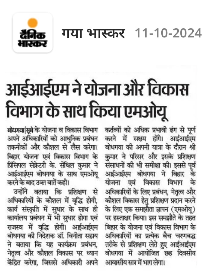 Memorandum of Understanding, MoU, Indian Institute of Management (IIM) Bodh Gaya, Dr. Vinita S. Sahay- Director of IIM Bodh Gaya, Planning and Development Department of Bihar, Mr. Senthil Kumar- Principal Secretary of the Planning and Development Department