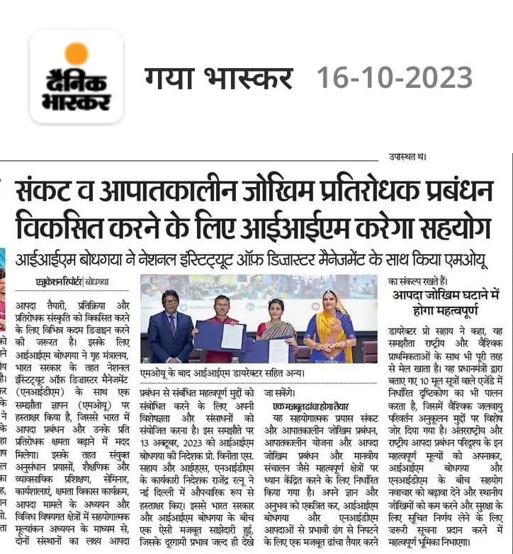 Memorandum of Understanding, MoU, Indian Institute of Management Bodh Gaya, Dr. Vinita S. Sahay- Director of IIM Bodh Gaya, National Institute of Disaster Management (NIDM), Shri. Rajendra Ratnoo- Executive Director of NIDM, IIM Bodh Gaya, IIMBG