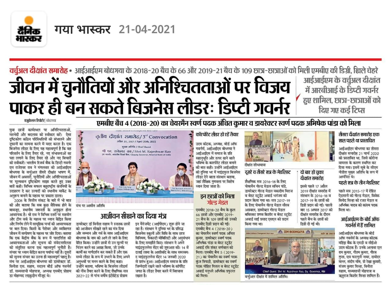 Convocation, 3rd Annual Convocation, Convocation 2021, Shri M Rajeshwar Rao- Deputy Governor of RBI-Chief Guest, Dr. Vinita S. Sahay- Director of IIM Bodh Gaya