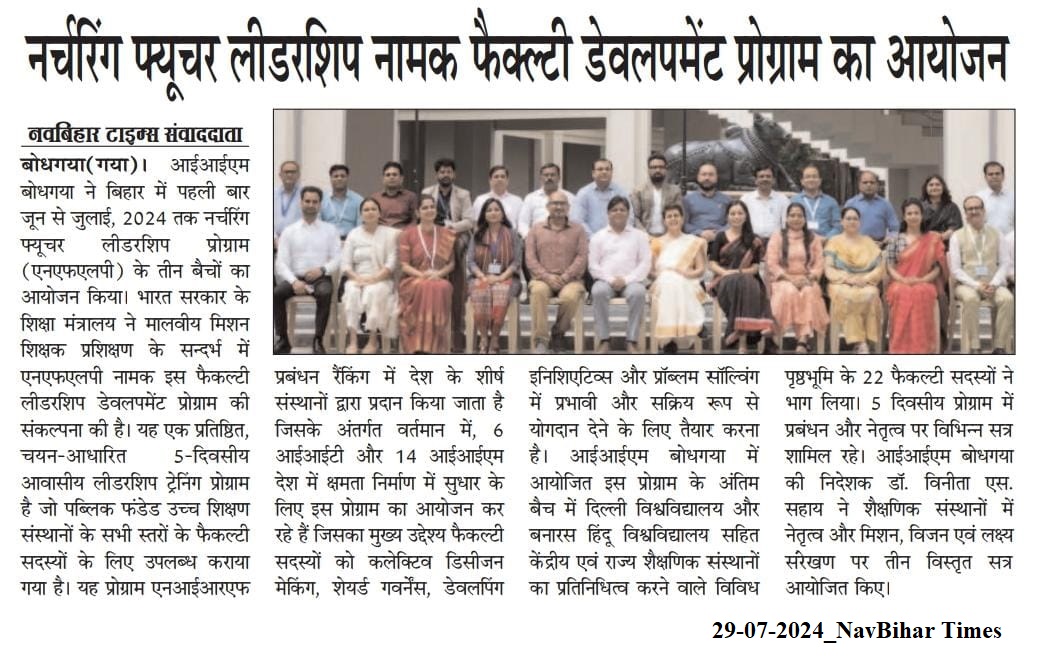 Faculty Development Programme, Faculty Leadership Development Program, Nurturing Future Leadership Programme (NFLP), Malaviya Mission Teacher Training Programme, Dr. Vinita S. Sahay- Director of IIM Bodh Gaya