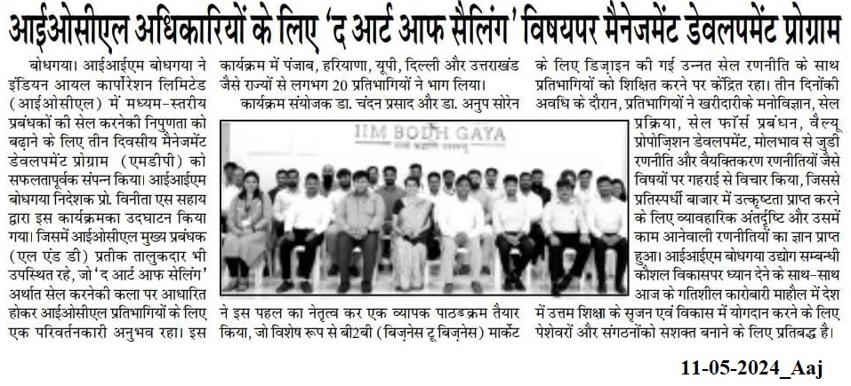 Management Development Program, MDP, Indian Oil Corporation Limited (IOCL), The Art of Selling, Dr. Vinita S. Sahay- Director of IIM Bodh Gaya, Mr. Pratik Talukdar- Chief Manager (L&D) at IOCL, Dr. Chandan Prasad- IIM Bodh Gaya, Dr. Anup Anurag Soren- IIM Bodh Gaya