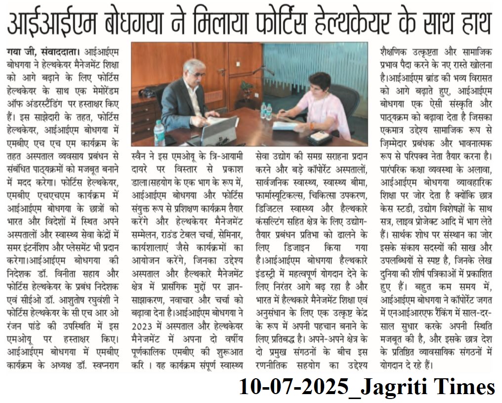 आईआईएम बोधगया ने मिलाया फोर्टिस हेल्थकेयर के साथ हाथ