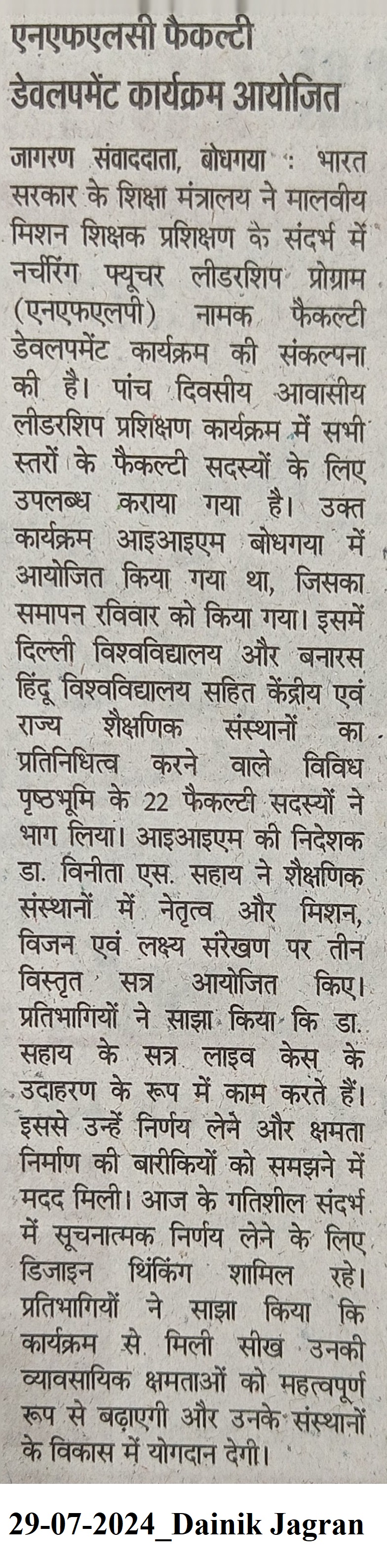 Faculty Development Programme, Faculty Leadership Development Program, Nurturing Future Leadership Programme (NFLP), Malaviya Mission Teacher Training Programme, Dr. Vinita S. Sahay- Director of IIM Bodh Gaya