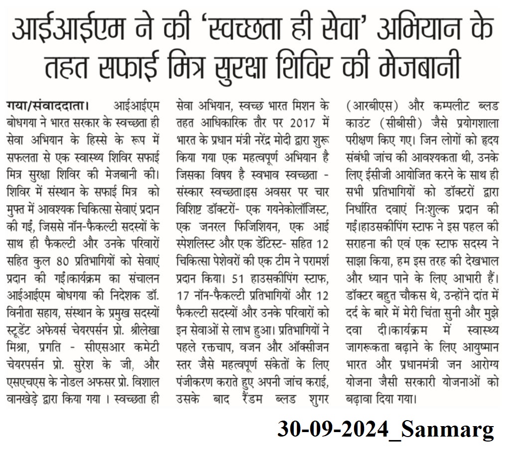Safai Mitra Suraksha Shivir, Swachhata Hi Seva (SHS) Campaign, Swachh Bharat Mission (SBM), Pragati–CSR Committee, Swabhav Swachhata–Sanskaar Swachhata, Health Camp, Dr. Vinita S. Sahay-Director of IIM Bodh Gaya, Dr. Sreelekha Mishra- IIM Bodh Gaya, Dr. Suresh K G- IIM Bodh Gaya, Dr. Vishal Wankhede, IIM Bodh Gaya