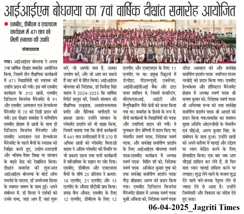 Convocation, 7th Annual Convocation, Convocation 2025, Dr. Vinita S. Sahay- Director of IIM Bodh Gaya, Dr. Janmejaya Sinha- Chairman of Boston Consulting Group (India), Mr. Arun Kumar Singh- Chairman and CEO of ONGC