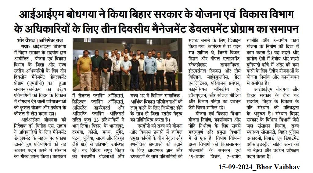 आईआईएम बोधगया ने किया बिहार सरकार के योजना एवं विकास विभाग के अधिकारियों के लिए तीन दिवसीय मैनेजमेंट डेवलपमेंट प्रोग्राम का समापन