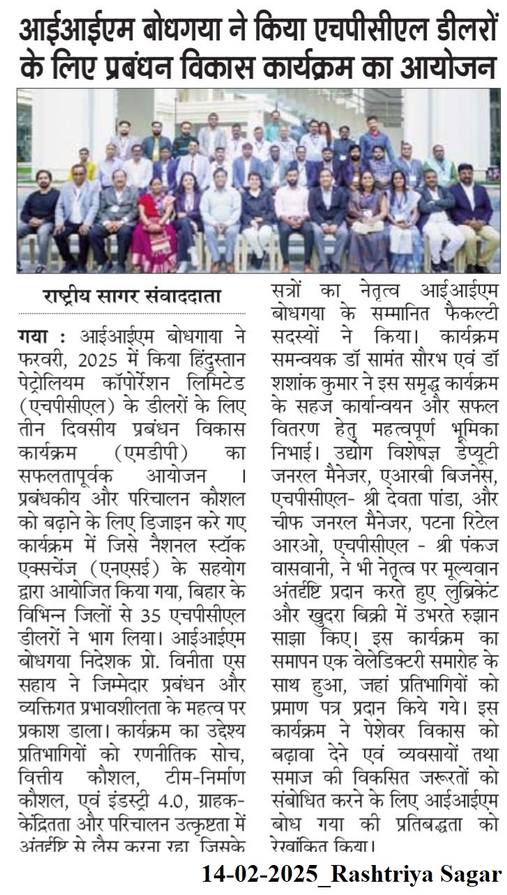 आईआईएम बोधगया ने किया एचपीसीएल डीलरों के लिए प्रबंधन विकास कार्यक्रम का आयोजन