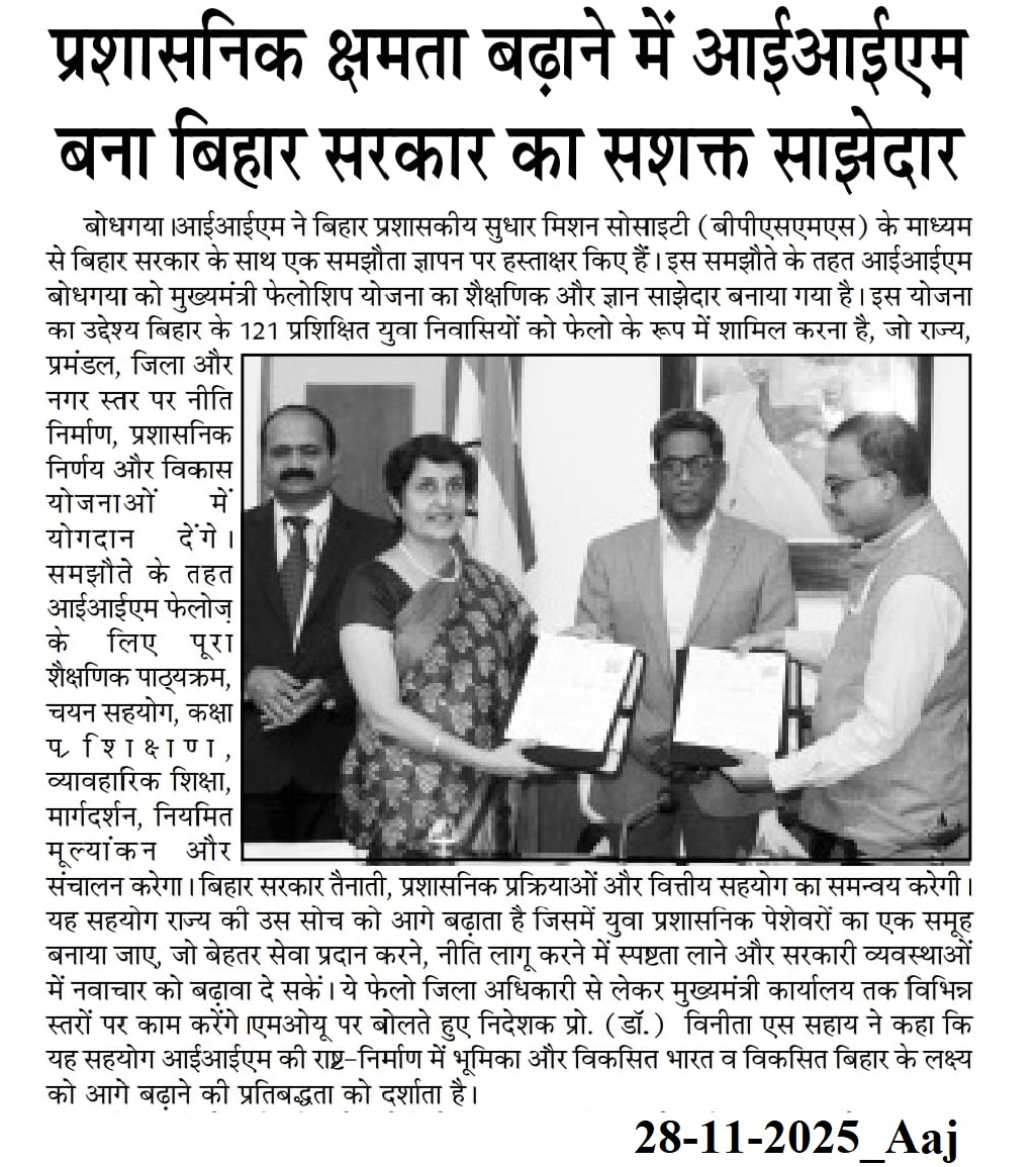Memorandum of Understanding, MoU, Indian Institute of Management Bodh Gaya, Dr. Vinita S. Sahay- Director of IIM Bodh Gaya, Bihar Prashasnik Sudhar Mission Society- Govt. of Bihar, Chief Minister's Fellowship Scheme (CMFS)- Govt. of Bihar, Viksit Bharat Viksit Bihar
